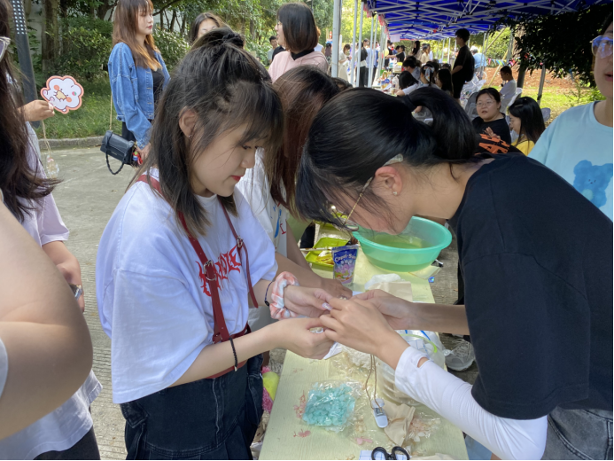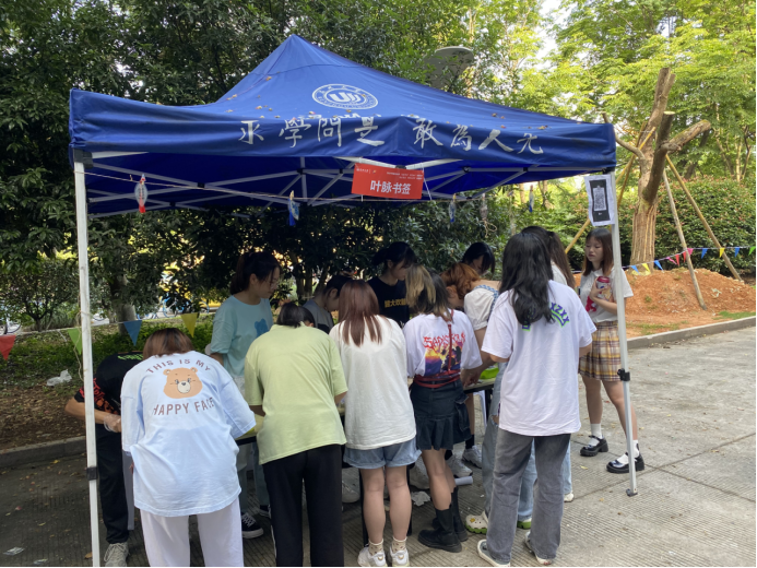 活动期间,很多同学对叶脉书签的制作很感兴趣,纷纷在摊位前停下脚步。通过工作人员的介绍与讲解,在场的同学们跃跃欲试,随后纷纷上手制作叶脉书签。叶脉书签的制作过程巧妙而有趣,由同学们自己挑选一枚喜欢的叶子,用牙刷在陶瓷盘上轻轻刷去叶子表面的叶肉,留下叶脉,经过清水的洗涤,洗去表面刷出的叶肉,直至显示出清晰的脉络即可。最后用吸水纸吸干水分,装饰一番,再用塑封纸进行塑封,一枚叶脉书签就制作好了。活动进行的热火朝天,每个参与活动的同学都感到十分愉快和满足。