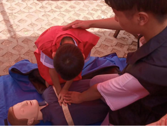 早上九点,暑期实践队的队员们已经到达场地,等待小朋友们的到来。不一会儿,小朋友们陆续到达活动场地,身穿红色志愿者马甲,成为了今天的小小志愿者。在本次活动里,小小志愿者们认真听警察叔叔讲解防诈骗知识,“有关钱财一定要小心,不要贪小财,失大财”;还在消防员的带领下了解消防常识。随后小志愿者们认真倾听了实践队员们对心腹复苏动作要领的讲解,并进行了实践练习;小志愿者们还了解了安全生产知识并为村民们进行了热心宣传。在义务骨科检查活动中,因为检查医生与村民们语言不通,小志愿者们充当了我们的“翻译官”,发挥了巨大作用。除此之外,小小志愿者们更学习了有关“拒绝毒品”“法律宣讲”等知识。
