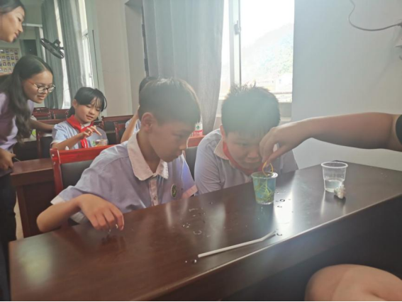 下午,实践队队员在北閣村文化大礼堂里带领小朋友学做科学小实验。通过鸡蛋在纯水与盐水中的沉浮现象对比和队员的讲解,小朋友们学习到了关于“密度”奥秘。随后又进行了“水的表面张力”小实验,向一装满水的水杯里放入回形针与橡皮筋,观察是否会使水溢出。在实验过程中,还穿插进了小比赛,在水杯中放入回形针与橡皮筋最多而水不溢出者为胜,小朋友们都全身心投入,积极参与,期望赢得胜利。在第三个实验中,小朋友们在观看实验演示后,对实验原理进行了积极思考,踊跃发言,相信他们对于“扩散”这个知识有了更深的认识。最后的实验也是最难的一个——水的虹吸,虽然难度较大,但小朋友们并没有放弃,依旧那么积极、认真。