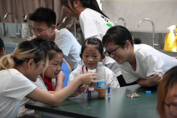 8:30前,小朋友们准时来到实验室,端坐在自己的座位上,眼中充满期待并安静地等待着老师上课。今天的课程与零食息息相关,每个小朋友都对此充满兴趣,并积极地抢答老师提出的问题。想必在听讲与抢答的过程中,小朋友们对食用色素、防腐剂以及垃圾食品有了一定的认识,今后在商场也能自主挑选健康的零食。接下来是净水小实验,这是小朋友们最为期待的环节。在实践队队员的辅导下,小朋友们依次将棉球、纱布、活性炭、石英砂、鹅卵石放进“净水瓶”中,在“净水瓶”中倒入泥浆水,满心期待的等待实验结果。在一番等待之后,每组小朋友都有了自己的实验成果并其带到讲台上展示,热烈的掌声充满了实验室。接下来是“你画我猜”小游戏。这一游戏完全调动了小朋友的热情,实验室内一片火热,今日的宣讲活动也在这片欢声笑语中接近尾声。上午的宣讲在拍完合照后结束。