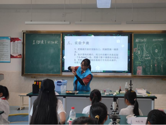 在进行细胞观察前,实践队成员开始调试显微镜,确保实验的顺利进行。同时也准备了观察材料,有洋葱、番茄、马铃薯。在显微镜调试完毕后,实践队成员制作了临时装片,以便小朋友们观察。