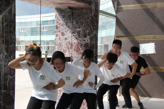 8:20前队员们统一着装准时到达大学生活动中心。在飞行部落训练师的带领下,实践队的队员们分成了三个队,每个小组推选出了一名队长,然后一起进行了热身活动。热身活动后,是海报设计。各个组在经过一番讨论之后,队员们大显身手,着手设计自己的海报。不一会儿,队名,队徽,队歌,组员昵称等一一呈现于此。接下来是介绍小组海报时间,在三个小组都展现了本组的活力与热情后,挑战便开始了。首先,迎接各个组别的是“挑战五分钟”。在这短短五分钟中内,组员们要完成4个项目——“管道传球”、“挑战指压板”、“定海神针”、“激情呐喊”。其中的每个项目都考验团队默契和合作能力,只要其中一个队员分散注意,就可能导致挑战失败。在40分钟的准备时间之后,挑战正式开始了。每组的每一位队员都积极应战,虽然在挑战途中遇到了许多困难,比如:在“管道传球”中,乒乓球总是中途掉落等,但是这些问题都能被克服,每个组都圆满地完成了挑战并围坐成圈,对本次挑战做出感悟。最后一环节是“挑战六十秒”。这个挑战不仅需要强大的记忆力,也考验队员们的应对突发问题的能力,这是一个紧张而又刺激的环节,当六十秒即将结束,培训师的激情呐喊给挑战增加了紧张的氛围,就在这样紧张而又激烈的环节中,今天的培训接近尾声了。上午的飞行部落培训在拍完合照后完美落幕。