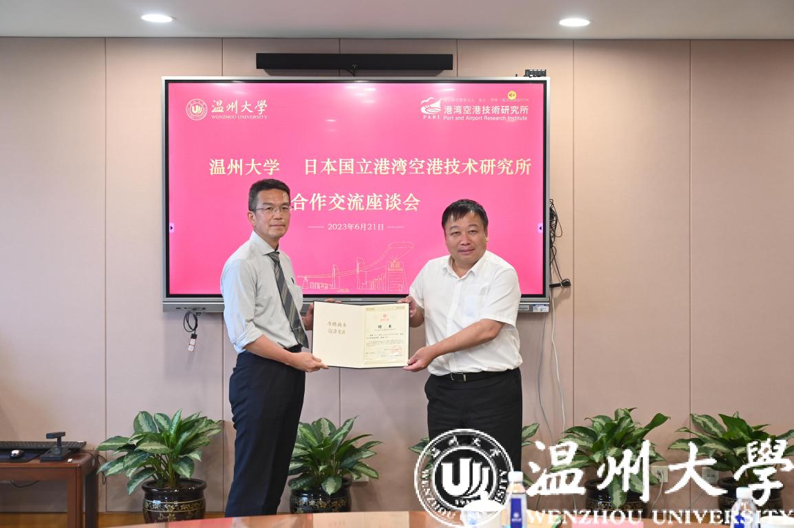 赵敏为井上徹教(INOUE TETSUNORI)颁发客座教授聘书。他代表永利集团对井上徹教的到来表示欢迎,并简要介绍了永利集团办学历史、学科建设、学术研究、人才培养等方面的情况。他表示,永利集团积极开展高水平国际科研合作,与东京大学、京都大学分别联合成立“国际水生态环境研究中心”、“国际水资源与水生态研究中心”,与日本理化学研究所(RIKEN)共同开展国家重点研发计划、国际合作专项项目“物理喷射分散技术处理湖库蓝藻水华的机理研究及应用”。他强调,希望通过双方互派人员交流研究学习,在水资源管理、水污染防治等领域开展深层次合作,推动相关研究走向深入。