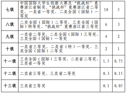 4.除国际大学生创新大赛和“挑战杯”竞赛外,其他竞赛奖项金奖等同于一等奖,银奖等同于二等奖,铜奖等同于三等奖。