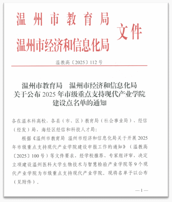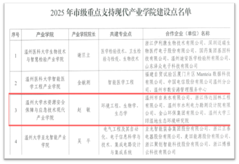 近日,温州市教育局与温州市经济和信息化局联合印发了《关于公布2025年市级重点支持现代产业学院建设点名单的通知》(温教高〔2025〕112号),我院申报建设的“水资源安全保障与应急技术现代产业学院”经过学校推荐、专家组评审,成功入选,标志着学院在产教融合与协同育人方面取得重要突破。