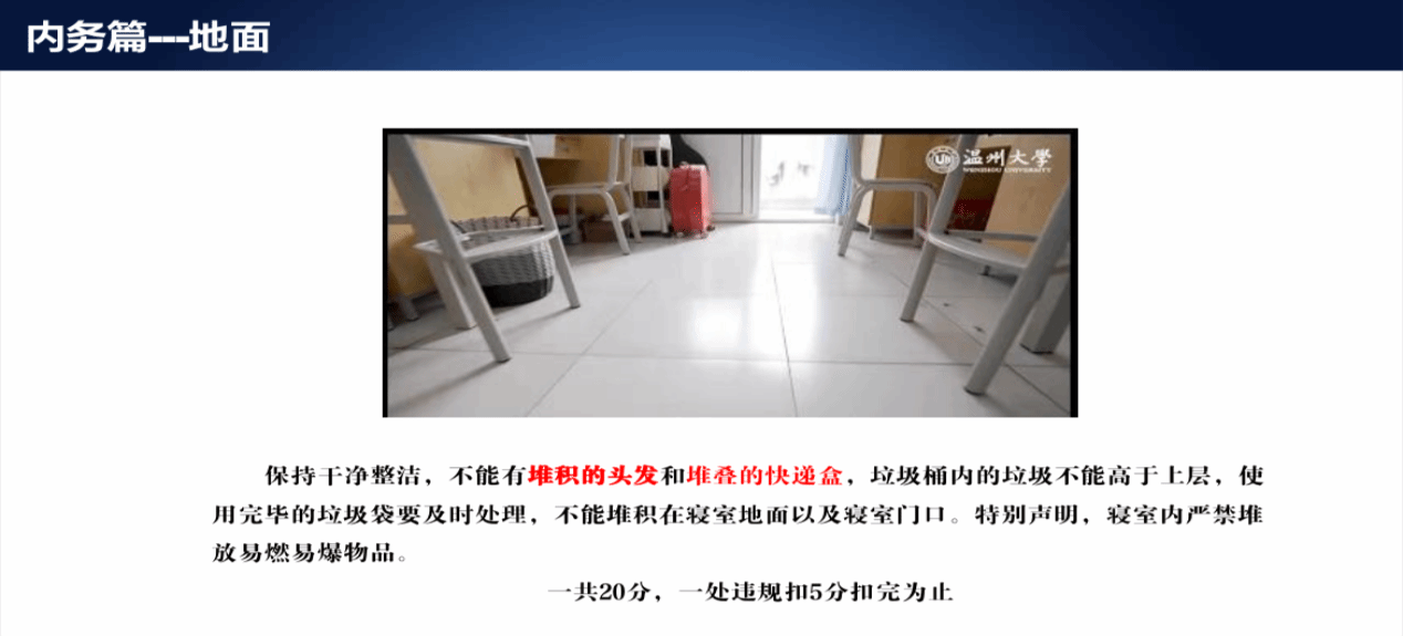 会议伊始,主持人陈瑞鑫老师对寝室内务相关事宜进行了全面且细致的讲解,比如地面要保持清洁,不能有明显灰尘和垃圾;床位和桌椅上的物品需摆放整齐,阳台不能随意堆放杂物等。陈老师深入阐释了寝室内务规范标准以及寝室安全重要意义、潜在风险与防范举措等多方面内容,使同学们对于如何打造整洁舒适寝室环境与构建安全和谐寝室空间有了清晰认知与深刻理解。