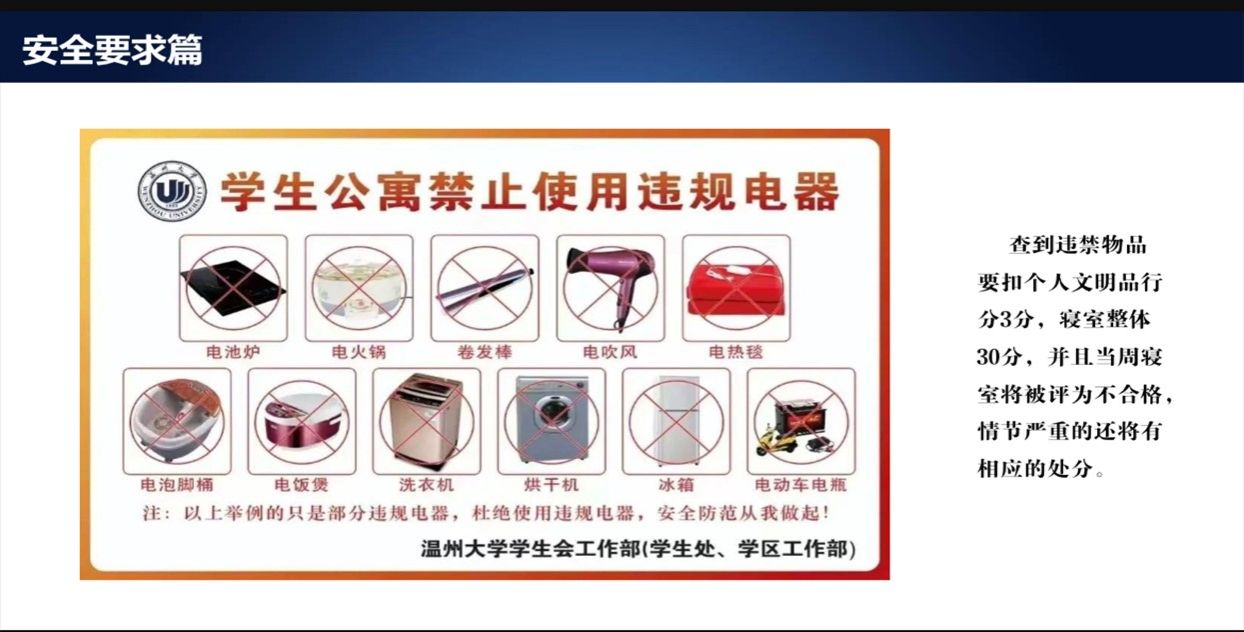 寝室用电安全是本次大会的重点内容。陈瑞鑫老师说明学院严禁学生在公寓使用违规电器,如电热毯、热得快、电炉等,并展示了常见违规电器的图例。此外,陈老师还提醒同学们不得私拉电线、网线,不能在室内使用明火,离开寝室要及时断电等安全用电事项。这有助于保障学生安全、培养学生自律能力和维护校园稳定秩序。