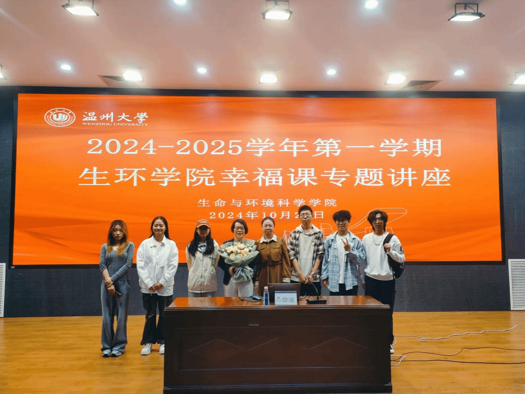 讲座结束后,同学们表示受益匪浅,一位同学认为此次讲座让他对幸福有了全新的认识。张亚萍老师为徐速教授献上一束鲜花,感谢徐速教授的倾囊相授,也呼吁同学们把今天所学的知识运用到日常生活中。最后,全体心理部同学上台和两位老师一起合影留念。