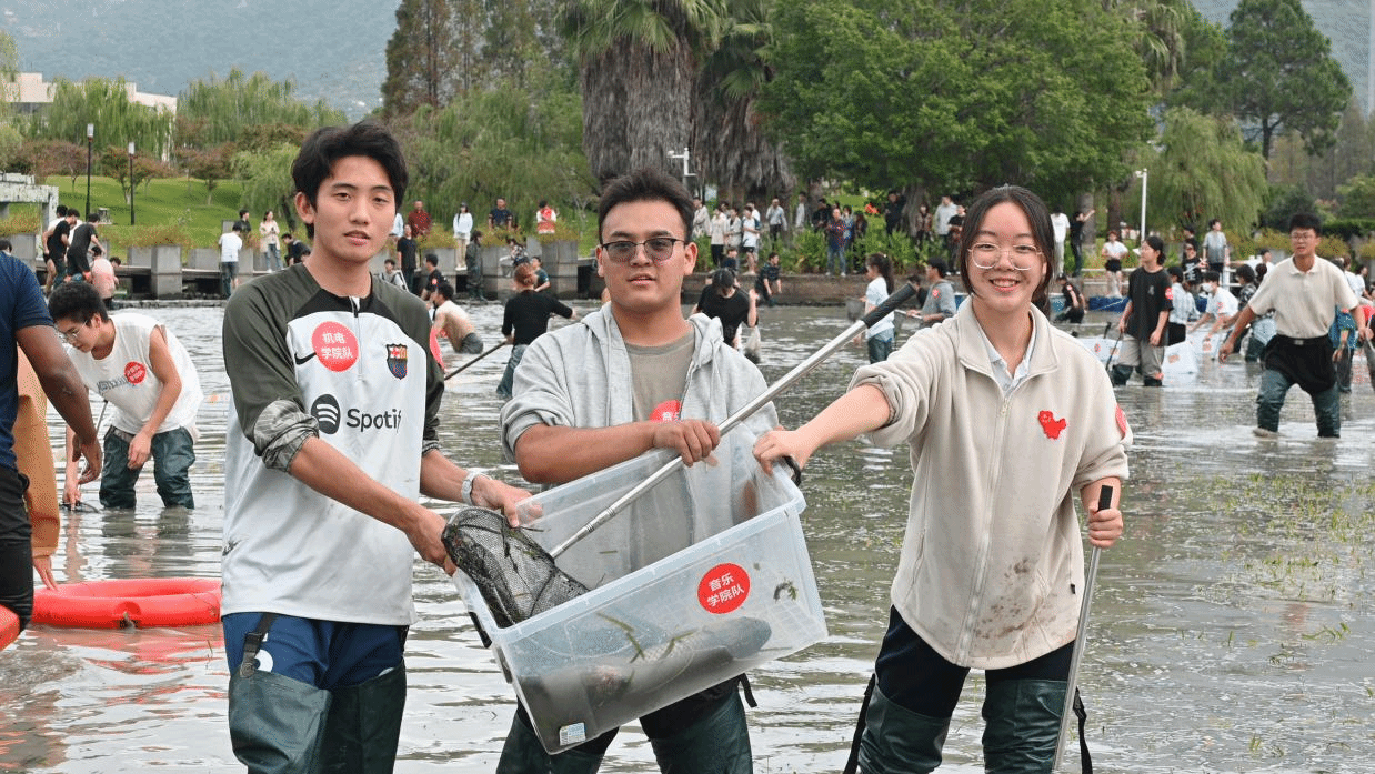 随着明心湖水面缓缓下降,岸边早已整装待发的师生们迫不及待地冲入水中,湖面瞬间热闹了起来,草鱼、罗非鱼等纷纷被抓入鱼桶中,岸边的师生也举起手机记录下这壮观的一幕。