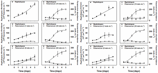 新型蓝藻水华--尖头藻(Raphidiopsis)水华因其产生蓝藻毒素和强大的入侵性而臭名昭著,并威胁着水域生态系统的稳定和人类的健康。原生动物草履虫因其强大的摄食能力而可以作为控制尖头藻水华的潜在生物。然而,草履虫的摄食能力却很大程度上取决于被捕食者的体积。同时,尖头藻种群由不同长度(或体积)的尖头藻藻丝组成。草履虫是否更倾向于捕食尖头藻种群中长度较短或体积较小的藻丝,并排斥那些较长的尖头藻藻丝至今仍不得而知。因此,本研究针对这一科学问题,对不同初始密度的捕食者草履虫(Paramecium sp.)和猎物拉氏尖头藻(Raphidiopsis raciborskii)进行共培养实验,以期解决这一科学问题。
