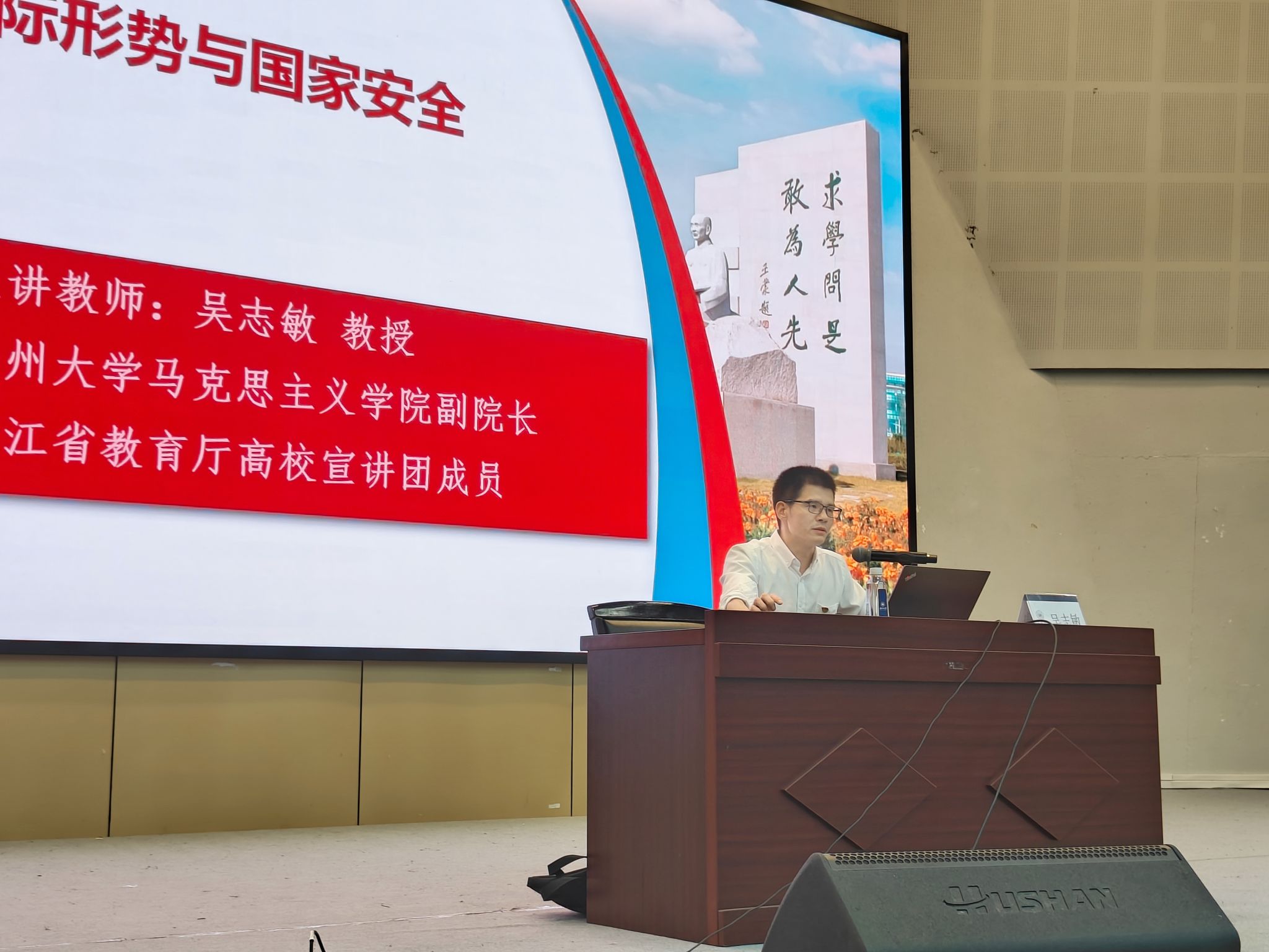 永利集团马克思主义学院副院长、浙江省教育厅高校宣讲团成员吴志敏老师带来专题讲座第四讲国情学习教育——《当前国际形势与国家安全》。吴志敏老师从世界百年未有之大变局加速演进,中国周边安全形势分析,大国关系调整的新态势、新特点、新趋势,“五位一体”外交战略新布局四个角度出发,逐层剖析了我国国家安全所面临的国际国内形势,阐释了应对世界动荡局势的中国方案和中国智慧。吴志敏老师以台湾问题结题,他表示,只要包括两岸同胞在内的所有中华儿女同心同德、团结奋斗,就一定能够粉碎任何形式的“台独”分裂和外来干涉图谋,祖国必须统一,也必然统一。