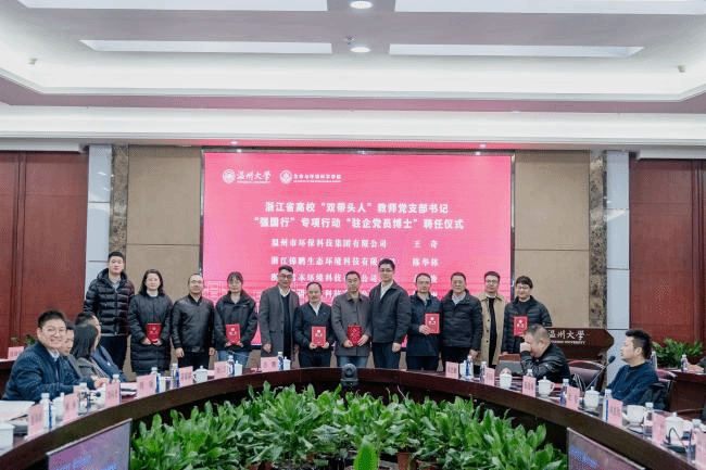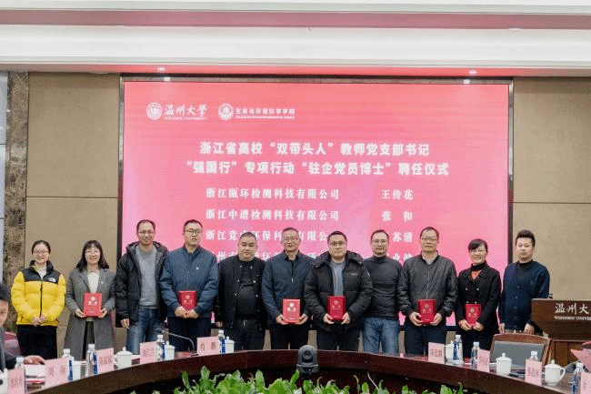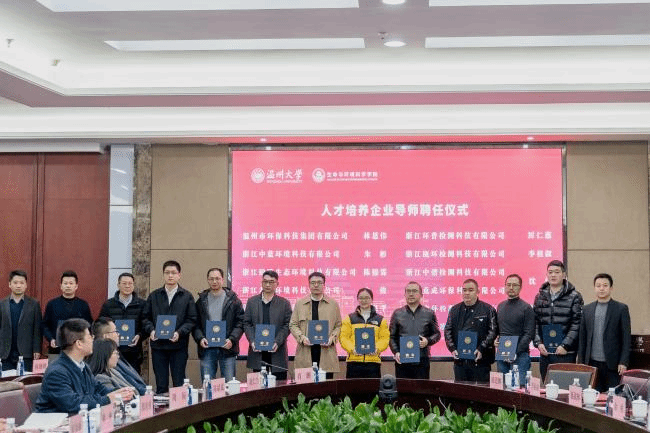 生环学院一直致力于充分发挥高校学科与人才优势,成立以服务地方、服务产业为主要导向的“生态环保党建联盟”。自2021年温州市环境科学学会、温州市生态园管委会、浙江中蓝环境科技公司、浙江中环检测科技有限公司等四家单位支持加入该联盟以来,本次又有10家企业响应加入,使得联盟成员扩员至15家。大会为新增成员单位代表授牌,并聘请联盟中12家企业的11位行业专家担任学院人才培养企业导师,同时选派党员博士驻企,进一步强化双向互动,为企业发展赋能。
