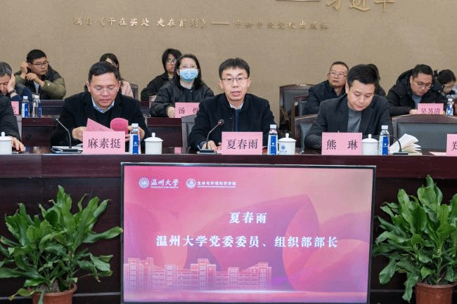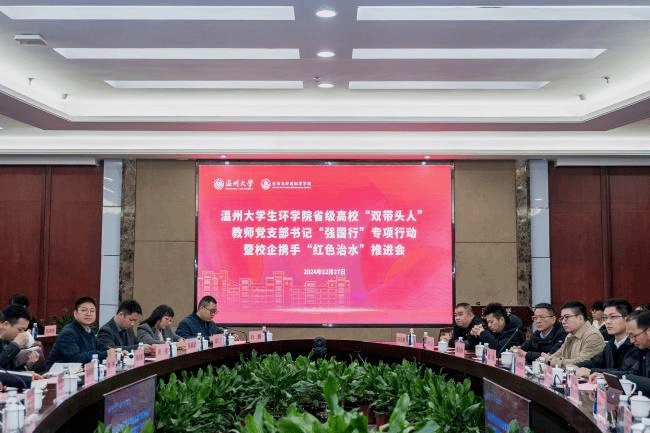 为进一步发挥党建引领的教师党支部示范作用,深化校企合作联学共建,将“红色力量”转化为高质量发展的“绿色引擎”,12月27日下午,永利集团生环学院省级“双带头人”教师党支部书记“强国行”专项行动暨校企携手“红色治水”推进会在南校区岩松堂白鹿厅举行。永利集团党委委员、组织部部长夏春雨,温州市生态环境局副局长麻素挺,温州市环境科学学会秘书长任一力,合作企业代表,校科技处、地方合作处等职能部门负责人,生环学院领导班子成员及师生党员代表出席大会,大会由生环学院党委书记李祖祥主持。