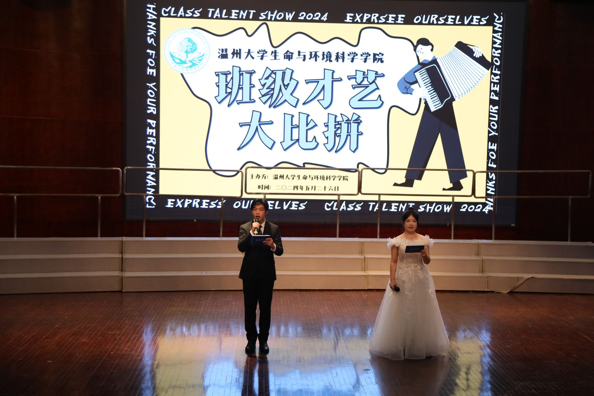 乘月载歌,起舞影清。为丰富同学们的课余生活,展现我院学子的青春风采,5月26日,我院于南校区音乐厅举行班级才艺大比拼活动。本次活动邀请了辅导员周啸鸣老师、戴胜杰老师、陈瑞鑫老师以及刘杭、杨雨晴、童淼飞、沈青霞同学作为评委出席本次活动。本次活动由吕建侨、陈燚洲主持。