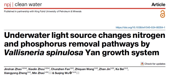 近日,国地中心赵敏教授领衔的分散式污水与流域生态治理团队在Nature旗下期刊《npj Clean Water》(SCI一区,IF = 10.4)上发表题为“Underwater light source changes nitrogen and phosphorus removal pathways by Vallisneria spinulosa Yan growth system”的研究论文。
