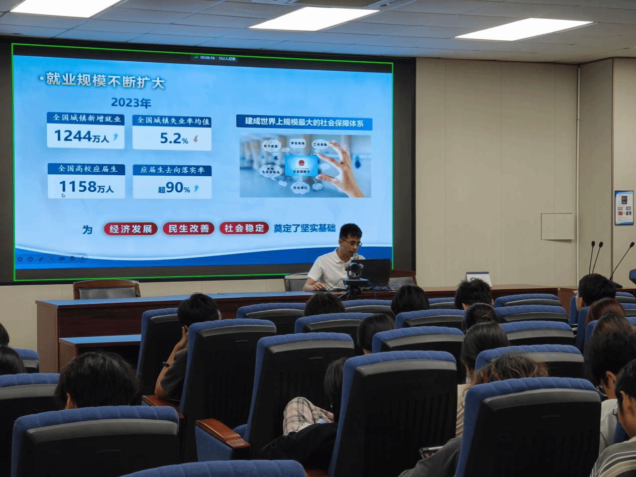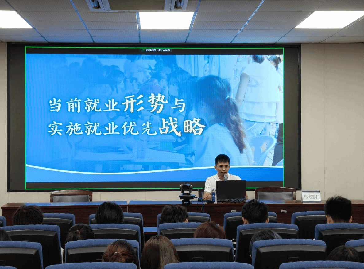 首先钱老师概述了当前国内就业形势,指出就业市场形势总体趋于稳定,就业质量稳步提升,尤其在重点群体(如高校毕业生)的就业方面保持了较为平稳的状态。同时,他也强调,就业压力依然存在,稳就业任务依然艰巨,总量压力与结构性矛盾依然突出,加之不确定不稳定因素的增多,为高校毕业生就业增添了几分挑战。紧接着,钱老师详细解读了国家层面的应对策略,强调就业是最大的民生工程,党中央高度重视就业工作,始终把稳定和扩大就业作为经济社会和谐发展的重要目标。他鼓励高校毕业生要把个人的理想与国家、社会、人民的需要相结合,要积极向中西部地区、民营企业和国家支持的重点行业靠拢,通过职业成长路径,提供更广阔的发展空间。