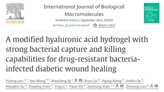 近日国际学术期刊《International Journal of Biological Macromolecules》(SCI一区TOP期刊,IF=7.7)在线发表了我院21级生物学硕士研究生兰玉龙的研究成果“A modified hyaluronic acid hydrogel with strong bacterial capture and killing capabilities for drug-resistant bacteria-infected diabetic wound healing”。