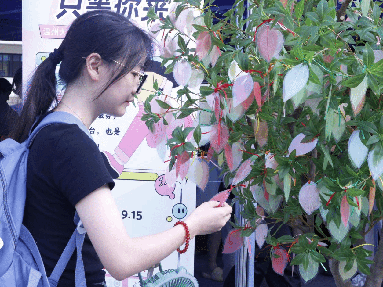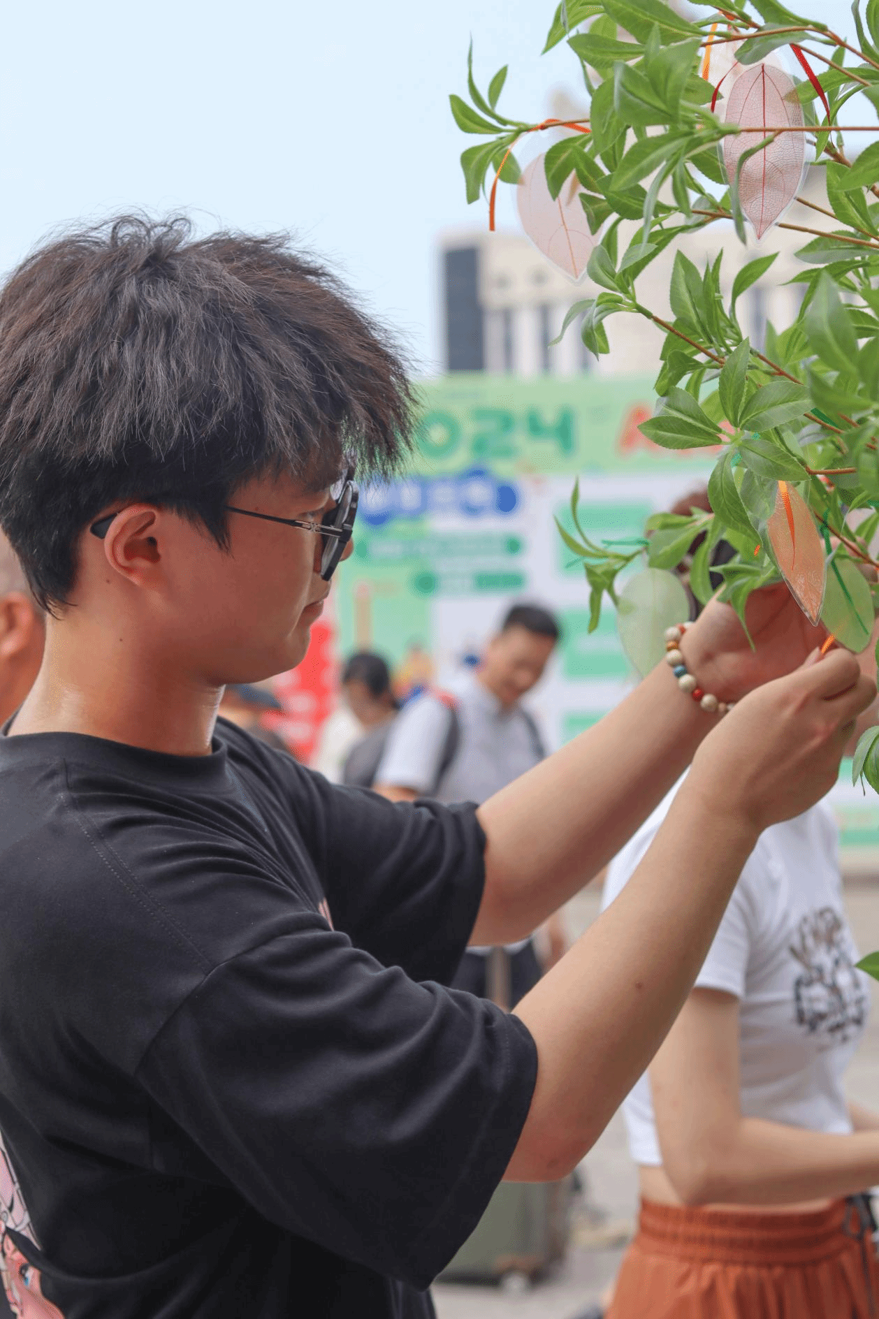 此外,以学院徽标为灵感打造的一棵寓意深远的“生命之树”,悬挂的500多个叶脉书签由生环学子利用专业知识亲手制作,寄托着学长学姐对新生的关怀和期待。新生们在树叶形状的便利贴上写下对学院的祝福与对大学生活的期待,与家长一起在树上结环,既寓意着学子对家长老师衔草结环的感激之情,也寓意着家长对子女长成参天大树的殷殷期待。