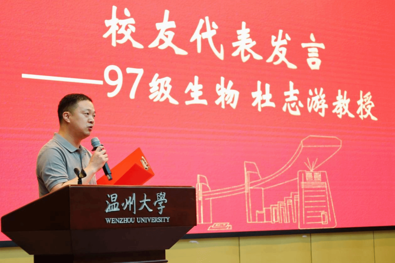 校友代表发言。97级生物优秀校友浙江理工大学生命科学与医药学院教授杜志游寄语全体毕业生,他从“热爱与坚持”、“创新与合作”、“责任与担当”三个方面分享自己作为毕业生的前辈在成长与学习中的感悟。同时,他强调了“终身学习”的重要性,以“未来属于那些相信自己梦想,并为之不懈努力的人”鼓励生环学子们继续勇敢前行。