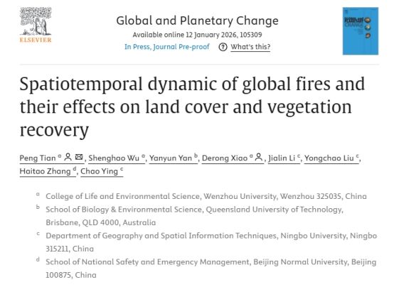 近日,我院田鹏博士在地球科学领域的权威期刊《Global and Planetary Change》(中科院一区TOP)上在线发表了题为“Spatiotemporal dynamic of global fires and their effects on land cover and vegetation recovery”的最新研究成果。研究构建了2001-2024年的全球多属性火灾数据集,并对火灾事件的时空分布、复合干扰格局,及其对土地覆被和植被恢复情况进行了深入分析。