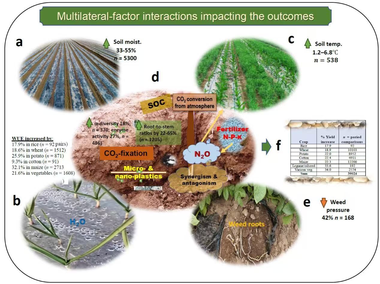 塑料污染已成为全球性环境挑战。来自170多个国家和440个组织的政府间谈判委员会(INC)代表先后于2024年11月在韩国釜山、2025年8月在瑞士日内瓦召开会议,旨在制定一项具有法律约束力的全球塑料污染终结协议。然而,由于在塑料生产、使用与环境影响之间缺乏系统、可靠的科学证据支撑,各方在核心条款上分歧明显,会议未能形成一致文本。针对这一关键瓶颈,该研究通过整合全球多区域、多作物、多环境条件下的研究数据,系统评估了塑料地膜在提高作物产量、改善水分利用效率等方面的积极作用,同时量化了其在土壤退化、微塑料累积及生态系统风险方面的潜在长期影响。在此基础上,研究团队首次从全球尺度提出了兼顾农业生产力与环境可持续性的优先行动框架,明确指出应通过技术优化、材料创新和制度设计的协同推进,逐步降低陆地生态系统中的塑料负担。