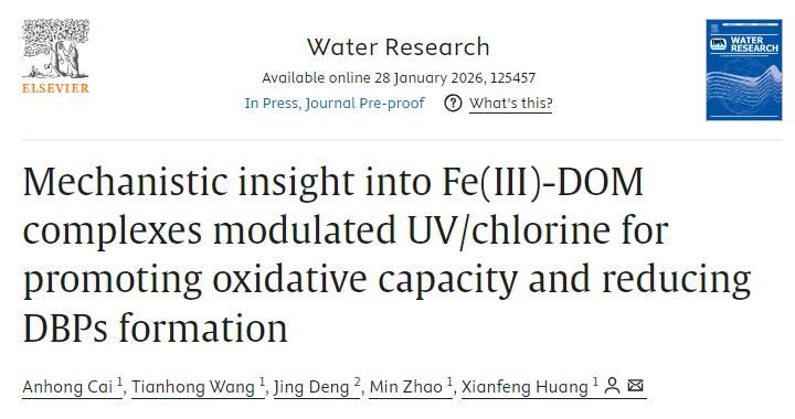 近日,我院黄先锋教授课题组在环境领域自然指数期刊《Water Research》(中科院一区TOP)上发表了题为“Mechanistic insight into Fe(III)-DOM complexes modulated UV/chlorine for promoting oxidative capacity and reducing DBPs formation”的研究论文。该研究探讨了天然水体中Fe(III)与溶解性有机质(DOM)的络合作用对UV/氯高级氧化工艺中污染物降解与消毒副产物生成的影响机制。