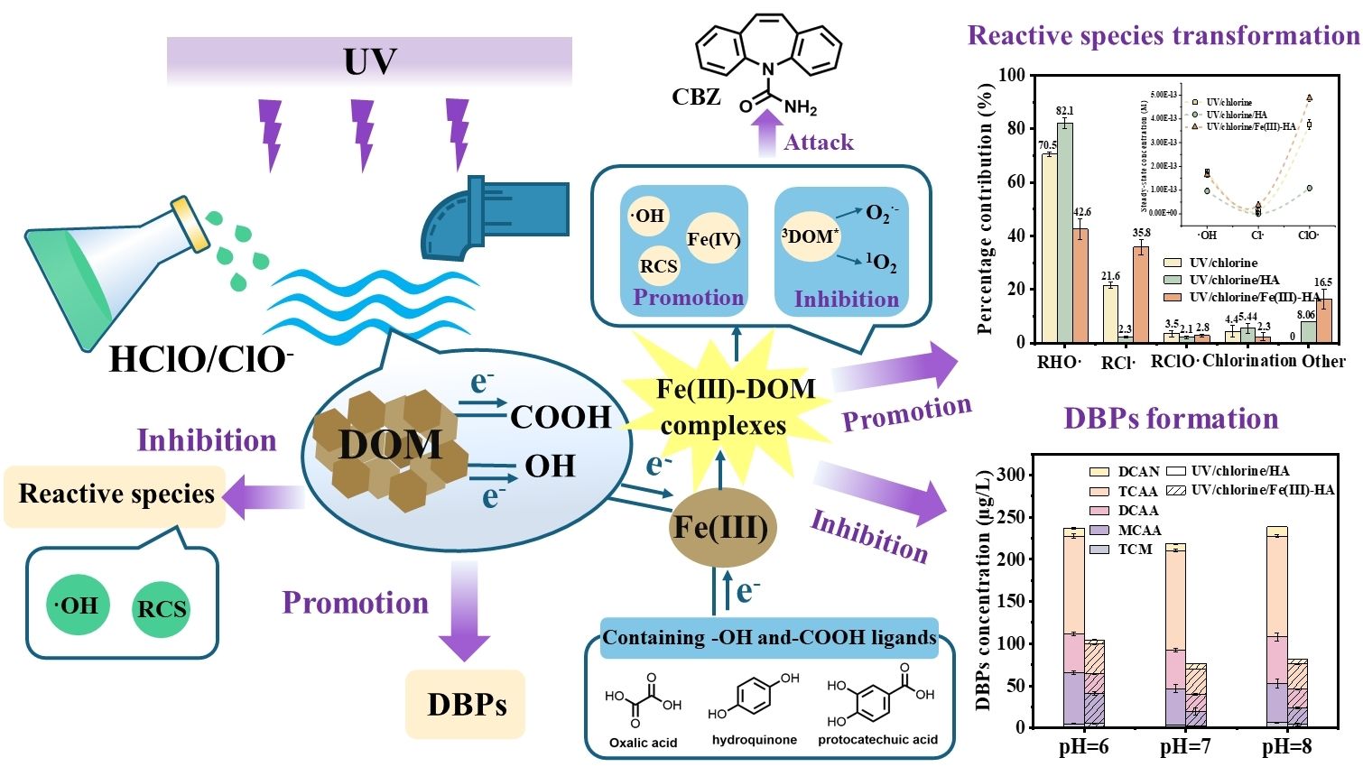 Fe(III)-DOM络合物调控UV/氯体系降解污染物并抑制DBPs生成潜能示意图