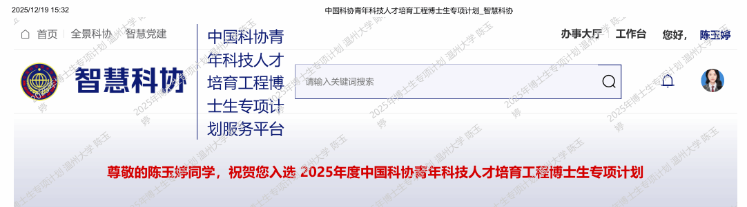 yl6776永利集团博士研究生陈玉婷入选2025年度“中国科协青年人才托举工程博士生专项计划”。该计划由中国科协发起,是国家层面实施的重要青年科技人才培养项目,旨在选拔支持具有突出潜力的在读博士研究生,通过学术引领、平台支撑、资源整合等机制,构建覆盖选拔、培养、发展的全链条支持体系,为建设科技强国储备后备力量。“中国科协青年人才托举工程博士研究生专项计划”于2024年首次设立,2025年全国培育5000余名博士研究生,...