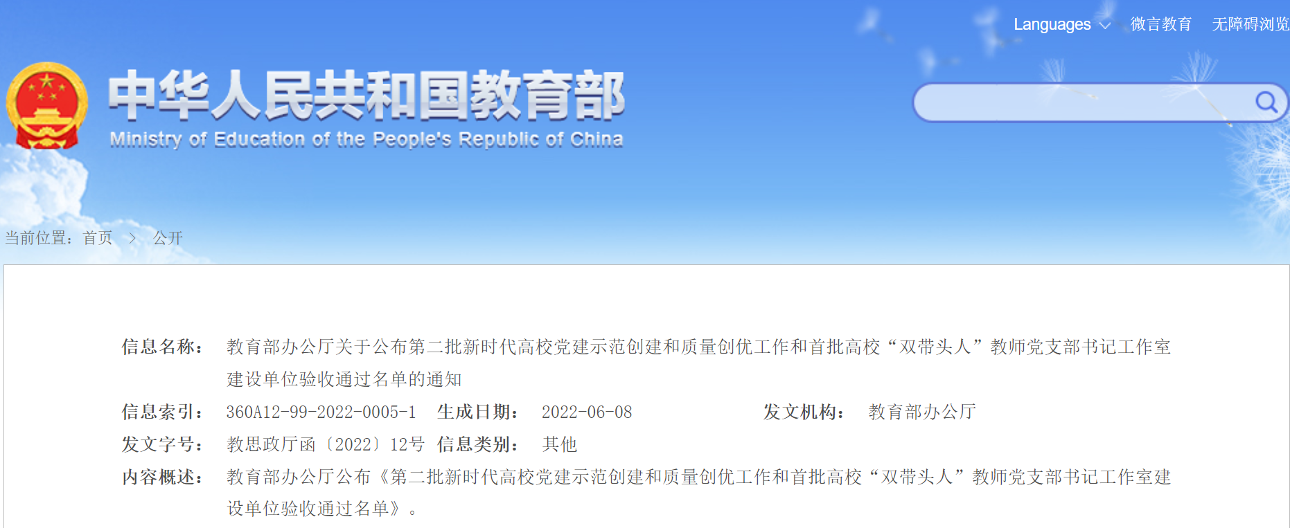 近日,教育部办公厅公布了第二批新时代高校党建示范创建和质量创优工作和首批高校“双带头人”教师党支部书记工作室建设单位验收通过名单验收通过名单,经建设单位对标自查总结、省级党委教育工作部门把关审核、教育部思想政治工作司审查、教育部政府门户网站公示,最终认定9个高校党委、98个院系党组织、990个党支部、99个“双带头人”工作室建设单位通过验收。我院教工第二党支部顺利通过验收,获评第二批“全国党建工作样板支部”!