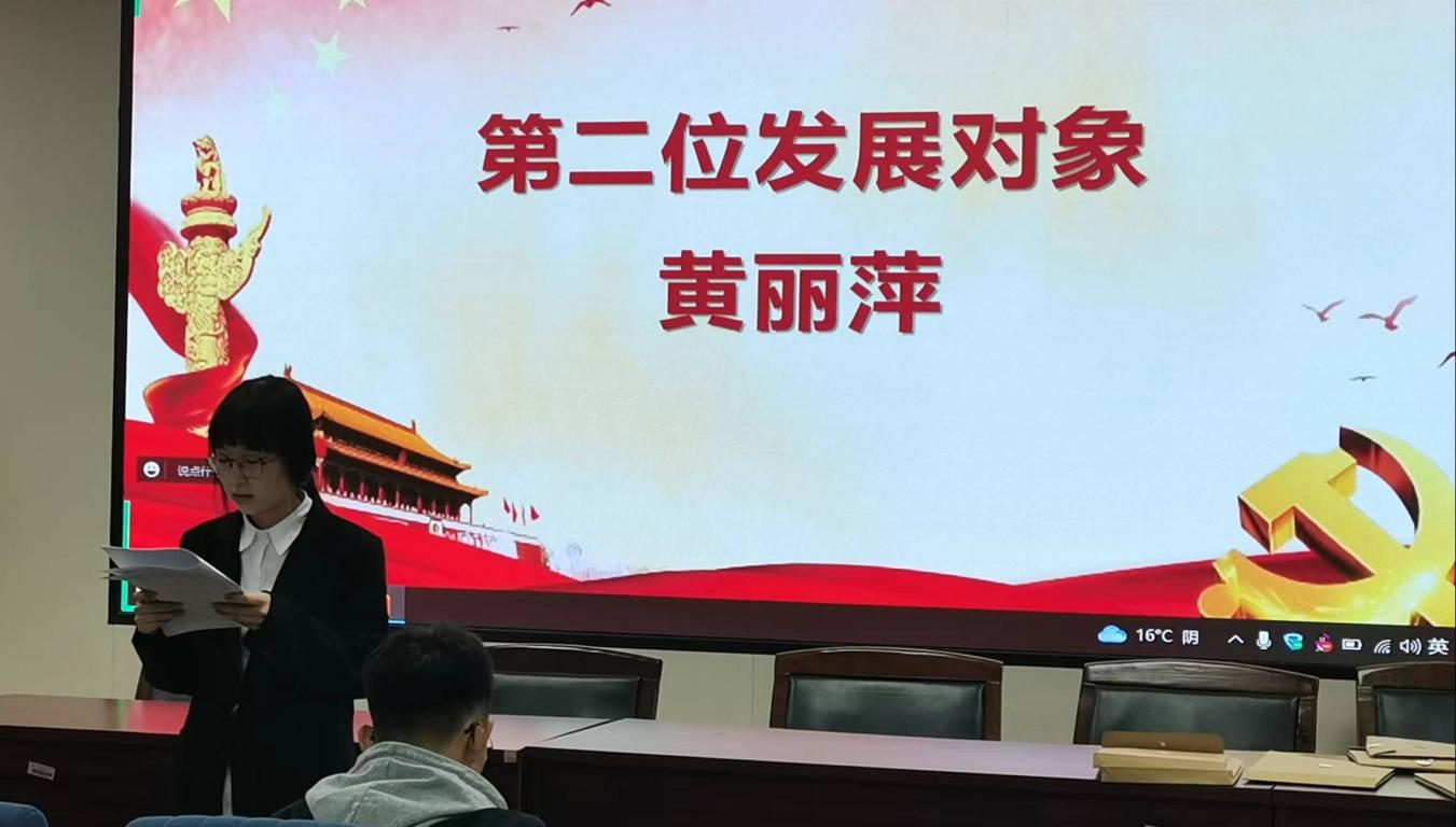 这次会议主要有五项议程:一是发展对象同志汇报有关情况;二是入党介绍人同志介绍发展对象有关情况:三是与会党员发表意见,对发展对象能否入党进行充分讨论:四是无记名投票表决。五是支部书记颁发党徽、带领宣读入党誓词。会上,3位发展对象宣读了自己的《入党志愿书》,向支部汇报了自身的入党动机,思想变化,传达了他们为共产主义事业奋斗终身的坚定决心。而后入党介绍人对发展对象进行介绍,与会党员和支委会进行讨论审查,从而了解了发展对象的优缺点,群众基础等相关情况。最后,在场有表决权的正式党员进行无记名投票表决,监票人、计票人进行监票、计票,3位发展对象均成功被发展成为预备党员。