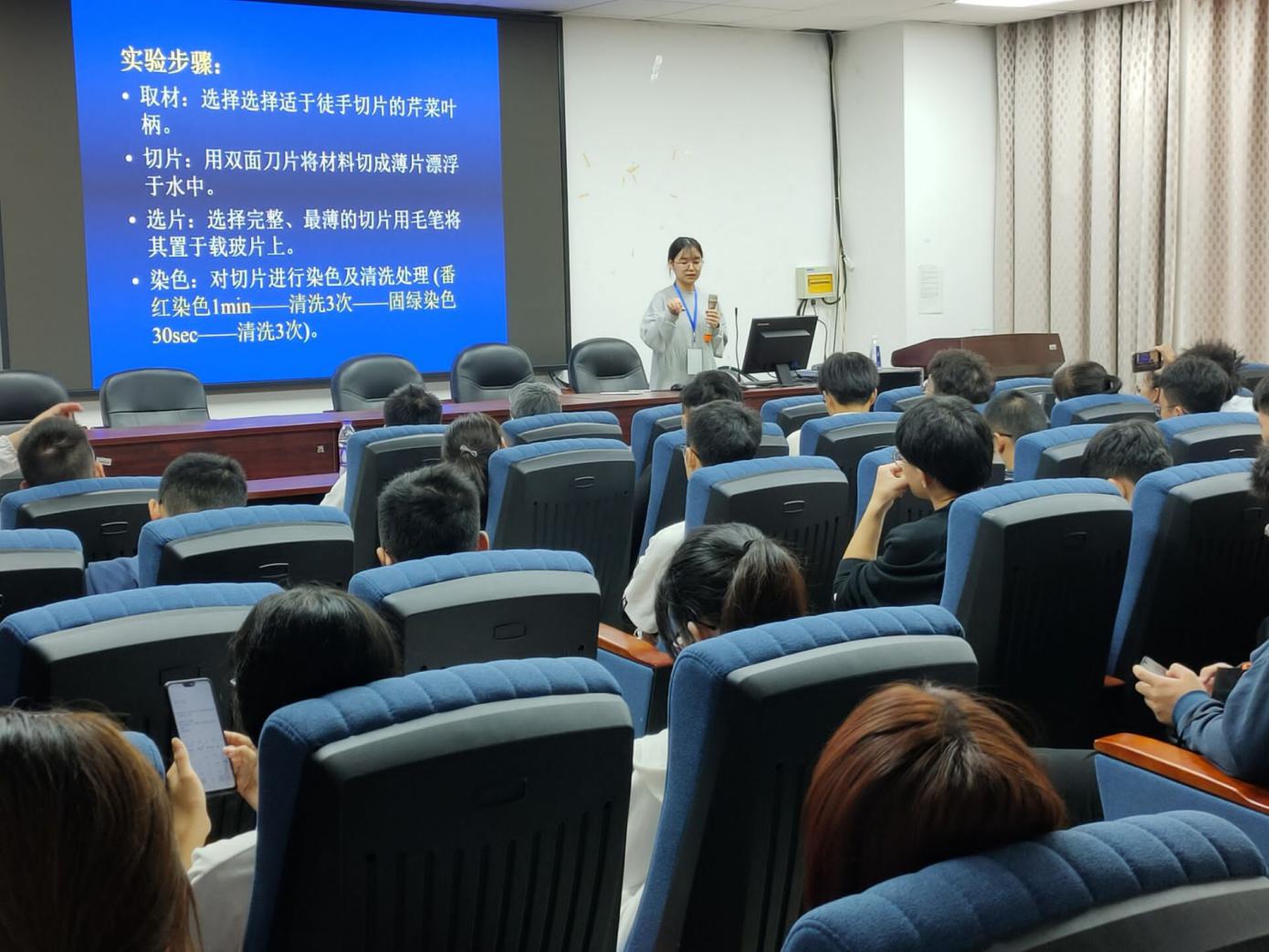 决赛采用实验操作形式,并于11月7日对各位参赛同学进行了主题为“芹菜叶柄临时装片制作并观察”培训。工作人员在会议室通过PPT和视频对实验对参赛同学们进行了讲解,然后由工作人员带领选手进入实验室,为各位选手们演示实验操作并发放实验服,参加培训的同学有序安静的在自己的试验台前进行实验操作,为明日的正式实验大赛打下基础。