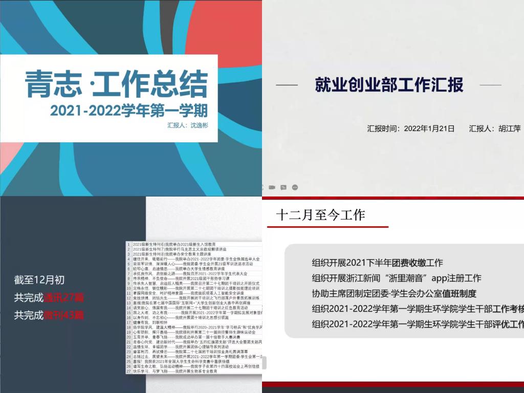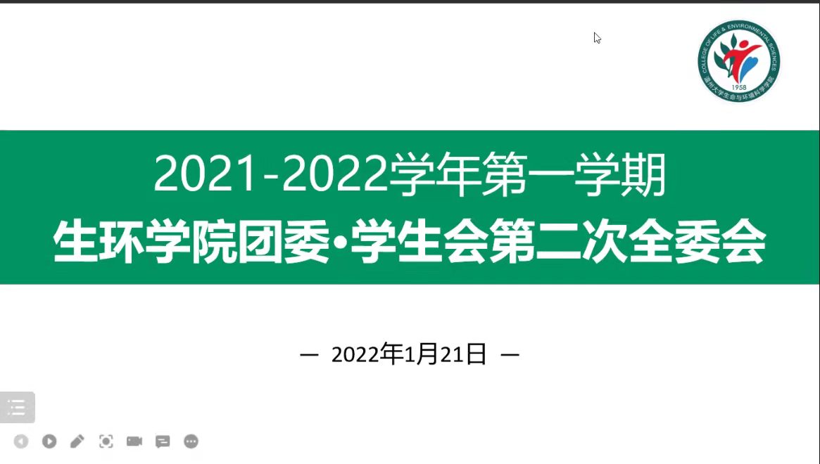 为更好地加强各部门协作力、凝聚力,建设与提升生环团委·学生会,2022年1月21日晚,我院于线上准时召开2021-2022学年第一学期团委·学生会工作总结大会暨第二次全委会。出席本次会议的有团委书记金海艳老师和辅导员梁家琳老师,我院团学全体干部参与本次会议。此次会议由执行主席蔡梦瑶主持。