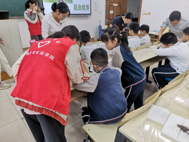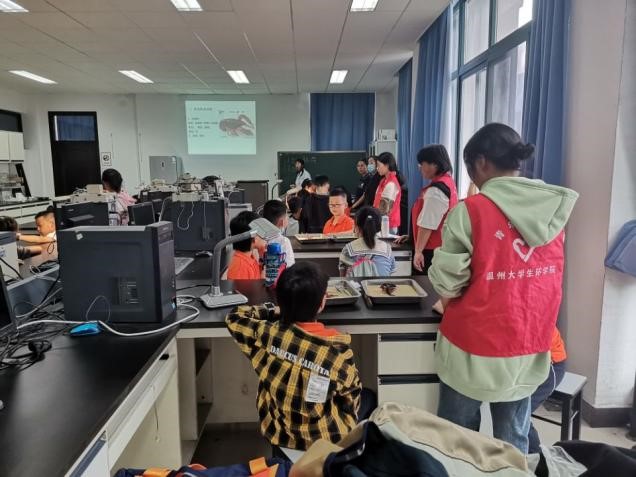 10月3日和10月5日的活动主题为“DNA一日营”。在老师讲解一些基础知识过后,志愿者们和小朋友们一起完成了DNA模型的制作并用香蕉做了DNA的粗提取实验,这让小朋友们近距离感受到DNA的神奇。10月4日和10月7日上午,小朋友们学习了昆虫的基本知识,并制作了蝴蝶标本。随后,老师和志愿者帮助小朋友们进行蝗虫的解剖实验,通过动手来认识蝗虫的身体结构。10月4日下午,志愿者和小朋友们从珍珠蚌中取出了珍珠并进行了蛭子的解剖,深刻认识了蛭子的身体构造。10月6日上午,在老师的安排下,志愿者们有序整理了实验室,为之后的实验开展做好准备。小朋友们在老师与志愿者的陪同下,成功观察了番茄、青菜、土豆、梨的组织和草履虫的运动,并完成实验报告。10月6日下午,志愿者和小朋友们一起学习了克氏螯虾的基本知识,并对其进行解剖。首先,由志愿者们剪下克氏螯虾的双钳。然后,小朋友们观察了克氏螯虾的足数和心脏,并分离出生殖器官。小朋友们脱离课本,通过自己动手做实验来了解雌雄生殖器官的不同之处,这样的做法体现了素质教育的培养模式。