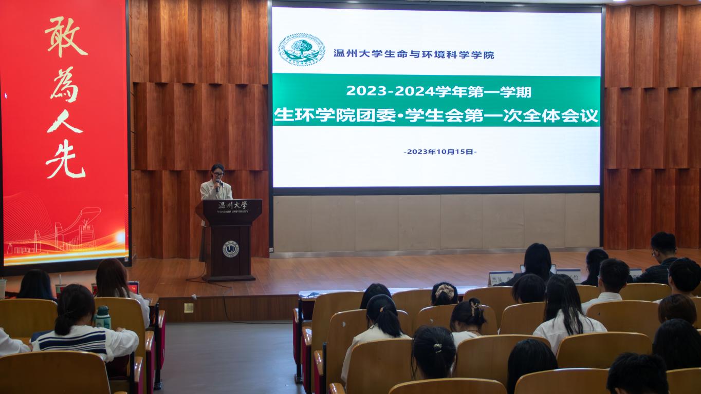 学生团委副书记汤文晗同学对2023-2024学年第一学期的工作进行了第一次总结汇报。她讲到在2023-2024学年中团学将加强培养团学干部的工作能力,强调制度化管理,同时加强我院学风建设,营造优良的思想氛围。团学一直秉承学生工作以学风建设为主线工作思路,切实建设学院的学风,督促学生的日常考勤及寝室卫生情况。本学期,我院团学将继续推进各项活动的举办,助力建设更具特色的生环学院!