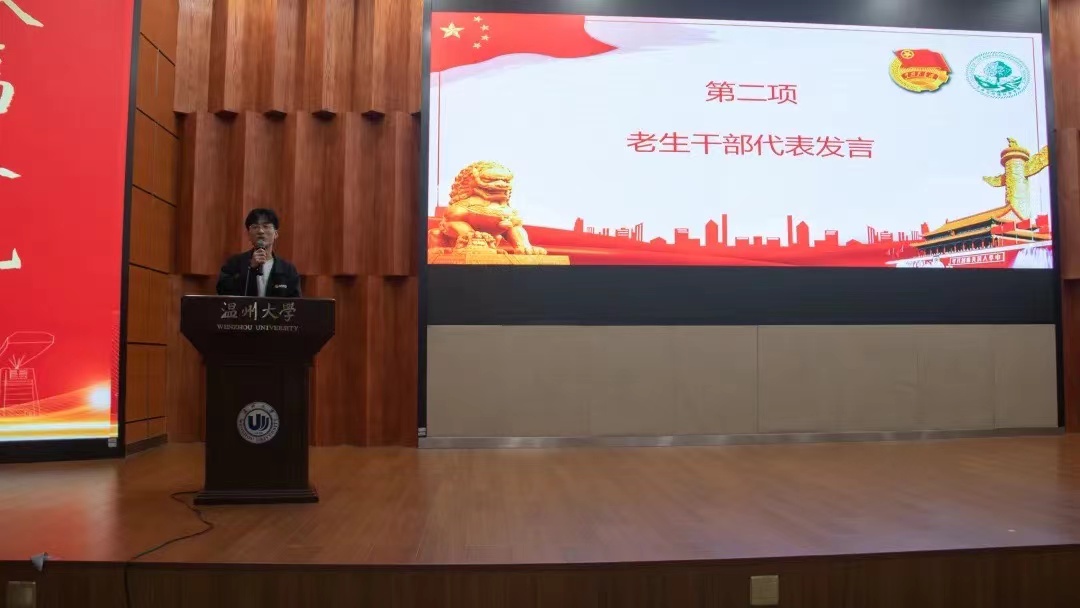 老生干部代表刘杭发言,他首先抛出问题:你成为学生干部的原因是什么?紧接着他给出自己的答案:提升自我,努力突破,展现自我芳华,他从自己大一刚加入团学开始,讲述自己如何一步步地成长为如今在多方面都小有成绩的老生干部代表。其次,他针对新生提出了两点要求:踏实工作,他指出新干部们要对工作有创新态度,打造具有组织特色的活动;对人要有礼貌,无论是是学长学姐还是老师,身为一名学生干部要又基本的礼仪。最后,刘杭同学提出两点希望:学习优先,要学会处理学习和工作的矛盾,做到两手抓;投入热爱,学生工作大多是枯燥的,需要我们保持一颗热爱的心,以饱满的热情投入学生工作。