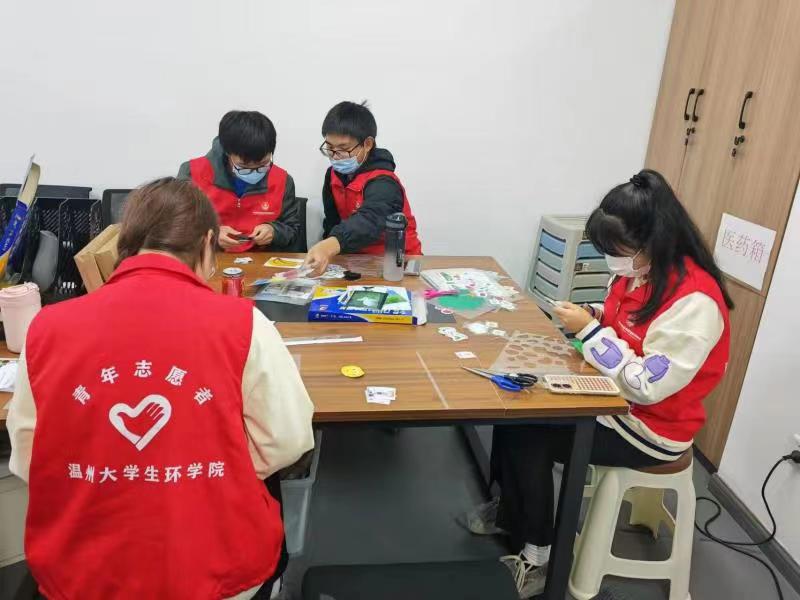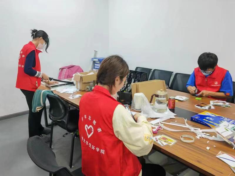中午12时45分左右,6名志愿者在我校南校区集合并步行至公交站,等待一段时间后搭乘公交车前往雪山路星之家培训中心。经过一个小时漫长的车程,志愿者们到达了目的地。穿上红马甲带上鞋套后,根据“星之家”负责人苌老师的安排与要求,志愿者们开始帮助老师制作教具。活动中,志愿者们细心且投入地做着老师们交代的任务。其中一位志愿者负责打印彩色小卡片,还有两位志愿者负责裁纸,剩下的几位志愿者们则负责塑封和磨圆角的工作。大家都有条不紊地做好自己的工作,同时也协助他人,使得教具的制作高效且有趣起来。五颜六色的答题板配上志愿者们精心制作的蛋糕、蝴蝶答案贴纸,相信星之家的小朋友们一定能感受到志愿者们心中的那一份温暖。活动进行到16:30结束,志愿者们在星之家培训中心拍照留念,与老师道别后踏上了归途。