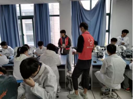 上午8:20,在负责人组织下,志愿者们有序地进行现场签到并领取志愿者服后,我院科创部相关工作人员开始对志愿者们进行相关注意事项及工作安排的培训。在传递完全部信息并确认志愿者没有其他工作问题后,志愿者们安静且有序地前往各自负责的区域进行有关工作。在此期间,志愿者们积极地为参赛选手们解决了合理需求,并保护实验器材和参赛人员的安全,同时进行实验相关操作的精准评分。第二场考试结束后,志愿者们有序地回到考务处进行签退工作。