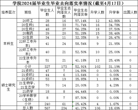 截至4月17日,2024届毕业生毕业去向落实率为41.27%,其中硕士毕业生毕业去向落实率25.42%,本科生毕业生毕业去向落实率52.91%,具体情况见下表。各班级、各导师要高度重视毕业生就业工作,切实采取有力举措,促进毕业生更高质量更加充分就业。