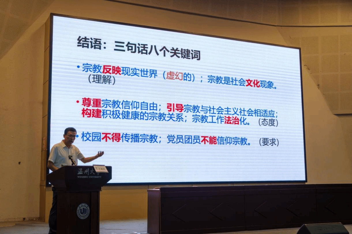讲座尾声,王教授聚焦新时代宗教工作,详细阐释了“八个关键词”。这促使学生深刻认识到宗教工作的重要性,明确自身在校园环境中应持有的理性态度——既要尊重信仰自由,更需坚守政治规矩和学术立场。