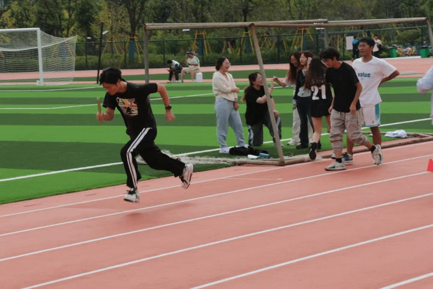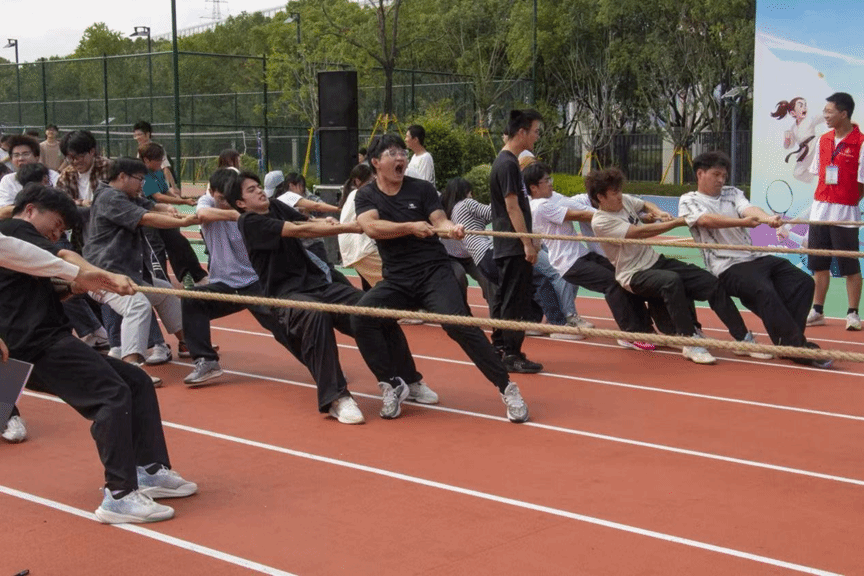开幕式后,趣味运动会有序开展,赛场瞬间被热情点燃:两人三足的队员脚绑脚、步同步,默契搀扶着稳步向前;毛毛虫项目中,同学们齐喊号子,步伐一致地向终点冲刺;集体八字跳长绳飞速轮转,选手们踩着节奏轻盈穿梭;在20×50接力赛上,接力棒的传递串联起速度与期盼;压轴的拔河比赛里,队员们紧握长绳、聚力相持,每一份坚持都凝聚着团队必胜的信念,各项比拼中尽显蓬勃活力与奋进姿态。