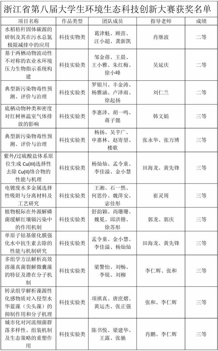 2025年11月15~11月16日,由浙江省大学生科技竞赛委员会、浙江省土壤肥料学会、浙江省生态学会联合主办的浙江省第八届大学生环境生态科技创新大赛在衢州学院举行。在我校生环学院学子的顽强拼搏与老师的悉心教导下,生环学院参赛队在此次比赛中获得省级二等奖3项、三等奖9项。