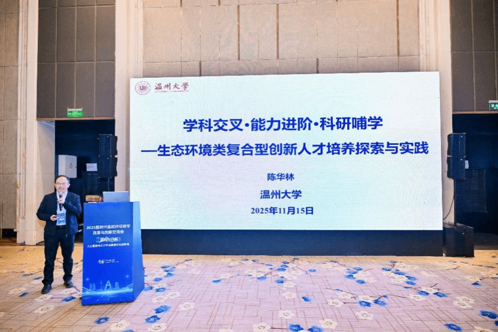 会议围绕环境类专业建设与拔尖创新人才自主培养、人工智能与课程教材深度融合、战略性新兴领域“十四五”高等教育教材体系建设、虚拟教研室建设与教师数字素养提升等关键议题展开深入研讨。我院教学团队陈华林教授在会上作了题为《学科交叉·能力进阶·科研哺学——生态环境类复合型创新人才培养探索与实践》的专题报告,系统介绍了我院在复合型创新人才培养方面的教学改革举措与成效,引发与会代表的广泛关注与热烈交流。