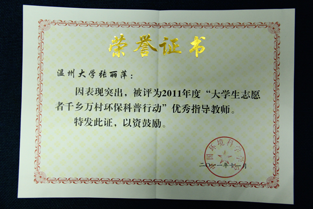2011年度浙江省大学生农村环保科普行优秀指导师(张丽萍)