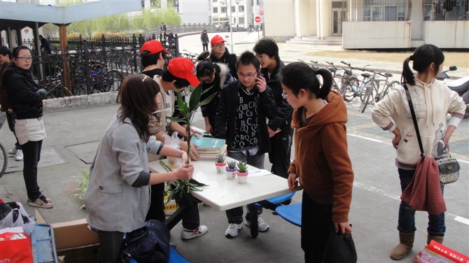 为大家送去一份绿意,同时也让更多的人意识到保护生态环境,共创绿色家园的重要性。我们将会员分往两个活动场所——动感地带门口处及9号楼对面两块场地。活动一开始,就有大批同学带着自己的废旧物品(旧书、旧衣服、纸箱等)蜂拥而至,来换取精美的植物,场面异常的火爆,活动得到了同学们积极的响应,他们精心挑选,仙人掌,虎皮兰,吊兰等等,一个个满载而归,脸上绽放出愉悦的笑容,通过这次活动,不仅可以让平时无用的废物得到回收,又可以换取可爱的绿色植物,让寝室的空气保持清新,营造温馨的氛围,有利于身心健康,真是一举两得。