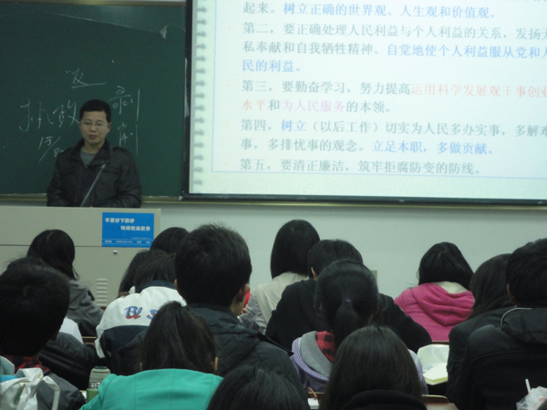 张胜帮老师从三个方面对学生们提出了要求,希望他们不仅要在思想上入党,更加要在行动上入党,清楚认识党员的义务与权力,并学会运用行驶党员的权利。他还简单举例了几个反面教材,从而使学生们树立党的宗旨:全心全意为人民服务。