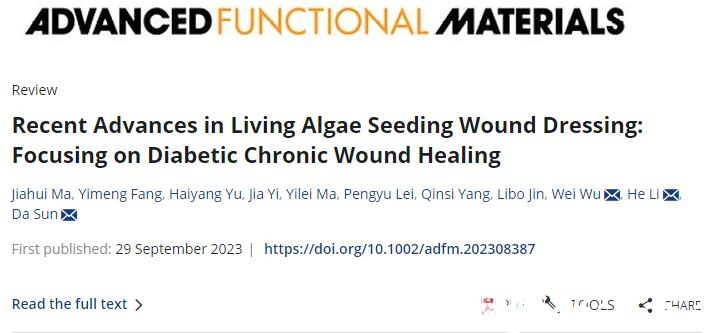 同时,我院2021级药学专业硕士研究生马嘉辉在《Advanced Functional Materials》(SCI一区TOP期刊,IF=19)上发表学术论文:《Recent advances in living algae seeding wound dressing: focusing on diabetic chronic wound healing》。