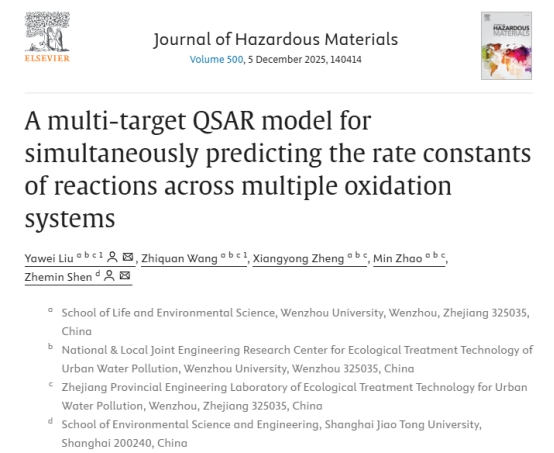 近日,我院赵敏教授团队在国际著名期刊《Journal of Hazardous Materials》(中科院一区TOP,IF=11.3)上在线发表了题为《A multi-target QSAR model for simultaneously predicting the rate constants of reactions across multiple oxidation systems》的最新研究成果。该研究面向大气环境中VOCs的多氧化体系反应过程,构建了首个可同时预测VOCs在•OH、O₃和NO₃•三类氧化体系中反应速率常数(kOH、kO3、kNO3)的多目标QSAR模型。