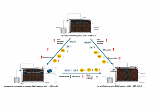 研究发现:在低温季节,传统地下渗滤系统(CK)TN去除率仅为20%,而好氧堆肥耦合系统(AC)和人工加热系统(AW)通过提升土壤温度,分别将TN去除率提高至30%和26%。两种增温策略均显著降低了温室气体排放:AC和AW系统的N2O累积排放量(FN2O)分别降低22%和20%;对CH4从排放源转化为吸收汇。经济性分析表明,AC系统具有最优的成本效益比(0.39),而AW系统因能耗过高不具备经济可行性。综合表明,AC系统通过好氧堆肥供热、提升微生物酶活性与优化菌群结构,实现了“水质净化–温室气体减排–资源回收”的协同增效,为低温季节农村污水低碳处理提供了可行技术方案。