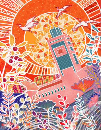 爱学校,携手共建美丽校园。“我的作品主要采用了永利集团周边的植物,包括银杏、杨梅树和一些叫不出名字但经常会出现的树,截取小部分元素在画面下半部分作为装饰和铺垫。上半部分加上温州当地田野经常出现的动物白鹭,画面中心主题是永利集团的图书馆建筑,图书馆前下半部分有较为抽象的河流与土地,上面有小鱼等等。整体的环境和动植物将图书馆紧紧围绕,背景是一个巨大的抽象太阳,后面还有小部分太阳能板和小型房屋建筑,主要体现人与自然和谐共生,将所有元素融合在一起,并用暖色调来进行色彩搭配,表现珍爱地球的主题。”马芳芳同学介绍了自己的作品。