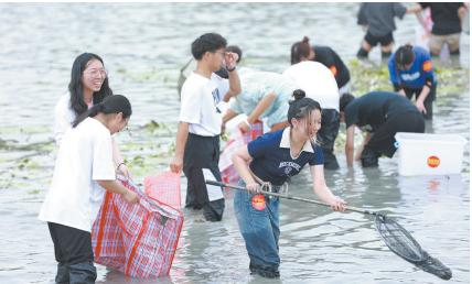 大闸拉起,水泵轰鸣,明心湖水缓缓下 降,岸边的同学早已穿上连体衣或下水鞋, 跃跃欲试。随着一声“开鱼咯”,湖面瞬间 热闹了起来,鳙鱼、鲤鱼、草鱼、罗非鱼等纷 纷被同学们抓入篓中。“我是大一新生,这 样的劳动课真是太有意思了。”生环学院学 生李逸鹏抓着刚刚捕捞上来的鲢鱼说,“把 学习的知识与劳动实践相结合,提高了我 的专业兴趣。”随着水面越来越低,湖底的 水草逐渐露出,另一批学生拿着割草刀依 次下水,热火朝天地忙碌,修剪苦草,捞除 白花荇菜。“我来自北方,今天也体验了一 把江南水乡的劳动,这堂劳动课很有意 义。”另一名学生说道。